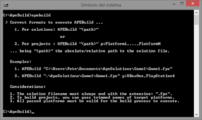 Now, there are a few restrictions: first, the solution filename must always end with ".fps"; second, the tool will handle trimmed versions of the platforms' names; third, all passed platforms must exist in the solution or the tool won't execute; and fourth, when you pass a relative path to the solution, the path to the folder where APEBuild is located will be considered the root folder in order to build the absolute path.